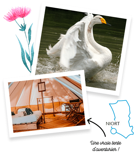 At the end of the day, we had a crepe in port d’Arçais ; a typical Maraîchin village. We strolled through narrow streets filled with art. And we had a funny experience by taking a ride on the Bief de la Garenne: going from one bank to the other in a chain boat! You just have to get into the boat on the bank and hoist the chain to reach the other side. And finally, a calm and refreshing stroll along the canal before settling into our trapper tent for a great, well-deserved night’s sleep, surrounded by animals.